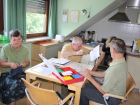 Gemütlich sieht es in der etwa 20 qm großen Mansarde in der Wohnstätte am Bitterbach aus. Helle Wände, die mit selbst gemalten Bildern, Mandalas und Fotos geschmückt sind, eine kleine Küchenzeile an der Stirnseite und einem großen Tisch in der Mitte. Drei Männer und eine Frau sitzen ...