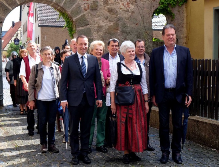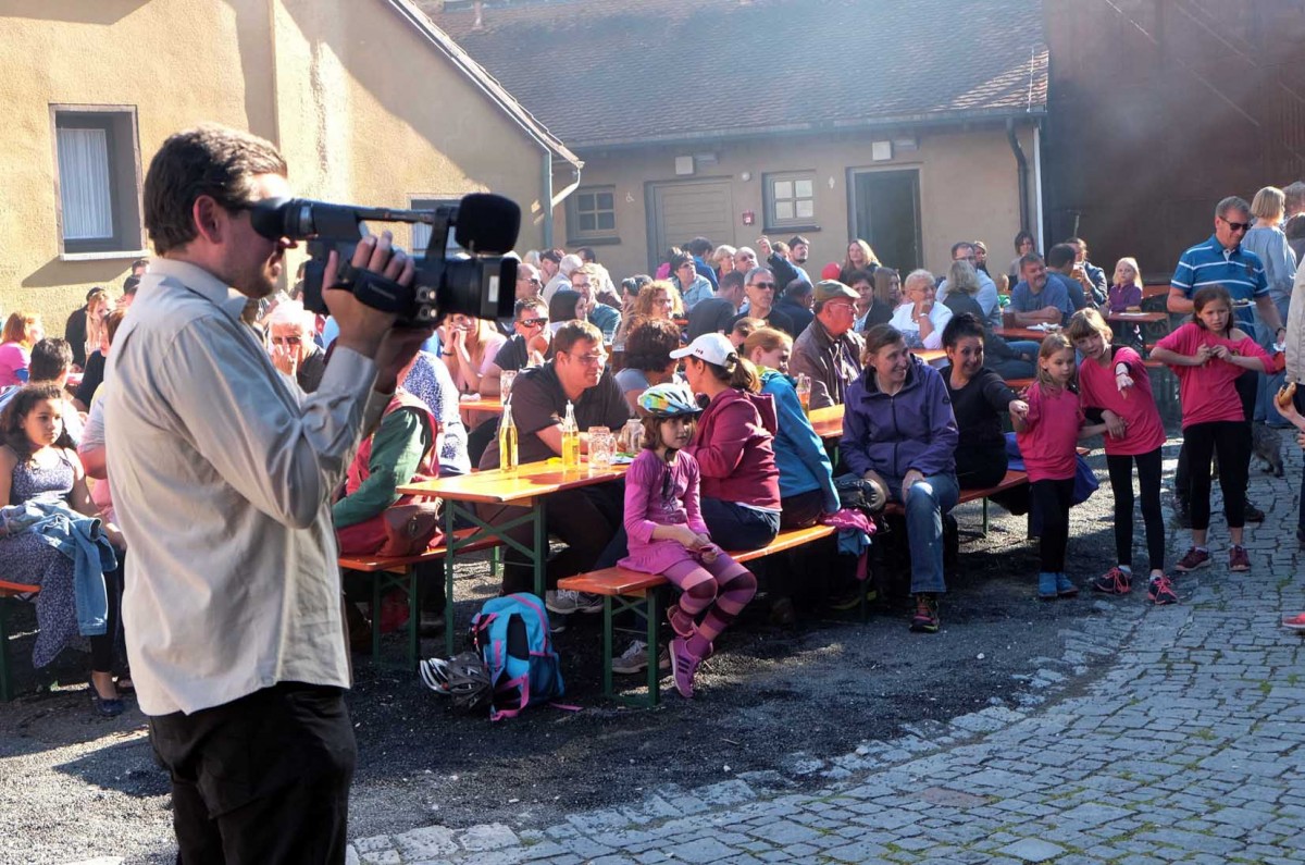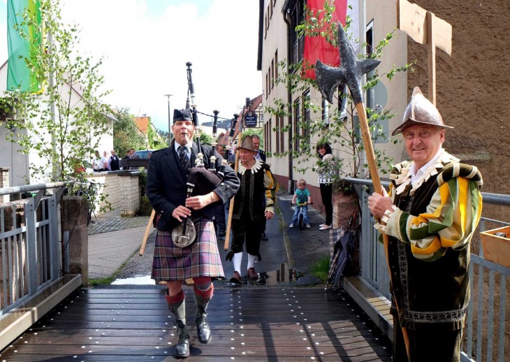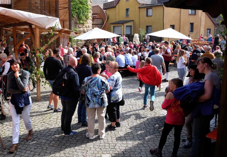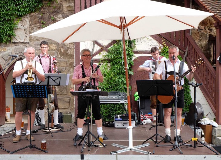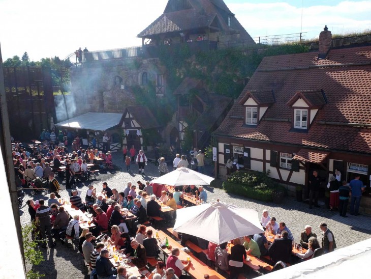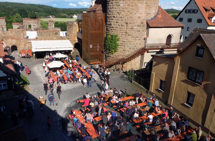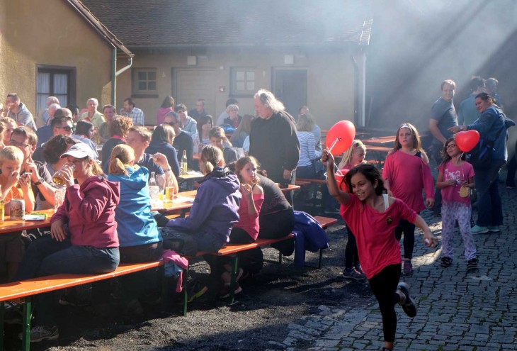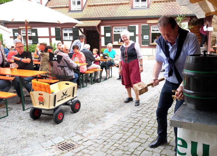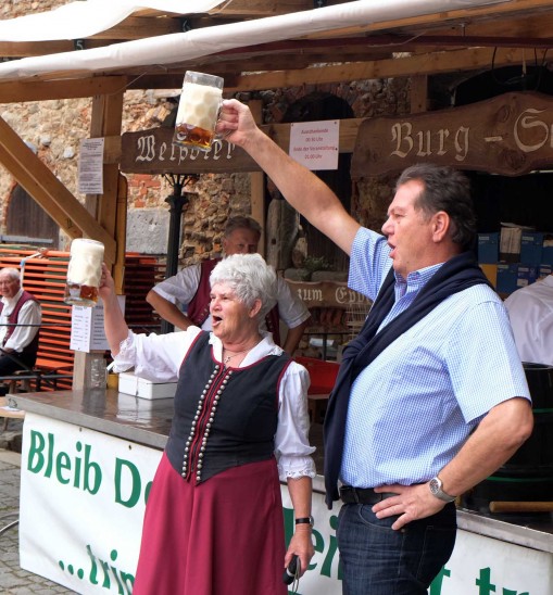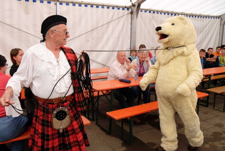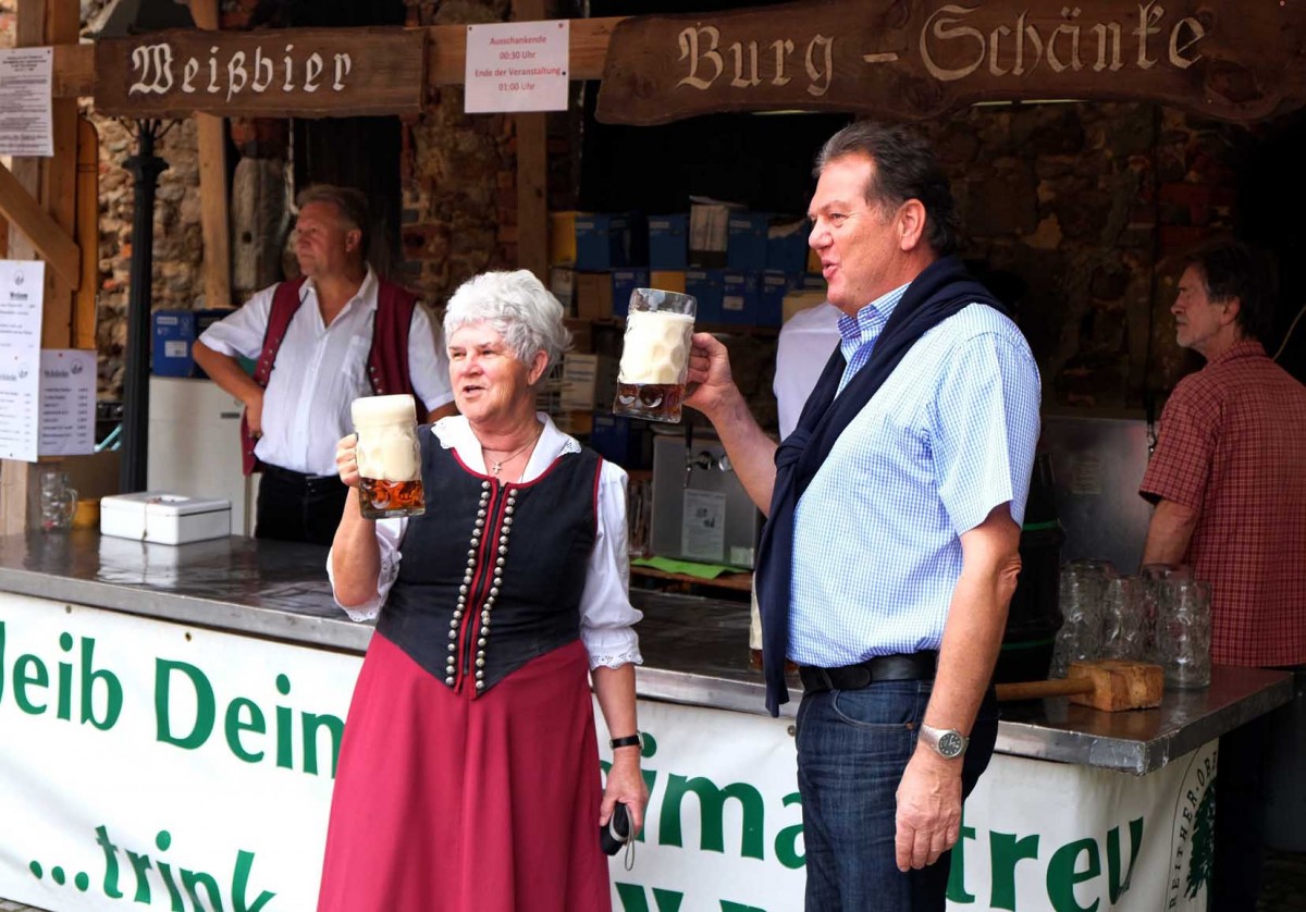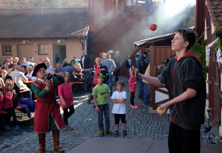 BURGTHANN – Der Burgthanner Burgverein hatte wieder zum Burgfest eingeladen. Betty Pünzner vom Burgverein kann man mit ihren Mitstreitern gratulieren, dass das Burgthanner Burgfest wieder einmal richtig gut war – nicht allein mit Essen, Trinken und Feiern, sondern mit einem Festprogramm, zu dem viele beitrugen – von den Models, die fränkische Trachten vorstellten über den meisterhaften Einradfahrer, den Jongleur und den Mikrofonzauberer bis zu den kleinen Zumba-Tänzerinnen, die sich einen Riesenapplaus beim Publikum abholten. Nicht zu vergessen der knuddelige Bär, den viele Kinder auf dem Burgfest sofort ins Herz geschlossen hatten und der zu den Klängen von Dudelsack-Spieler Thomas Schalla durch die Burg tanzte. Eröffnet wurde das Fest heuer schon vormittags mit einem Bieranstich durch Bürgermeister Heinz Meyer. Nachmittags empfingen die Burgthanner dann ihre Ehrengäste am Burgtor. Helmut Buchner, Intendant der Eppelein-Festspiele, erzählte vor großem Publikum in gereimten Versen von der Entstehung der Burg und deren weiterer Geschichte. Im kommenden Jahr bringen die Burgthanner erneut die Festspiele über den asozialen Helden Eppelein von Gailingen auf die Bühne im Burghof.