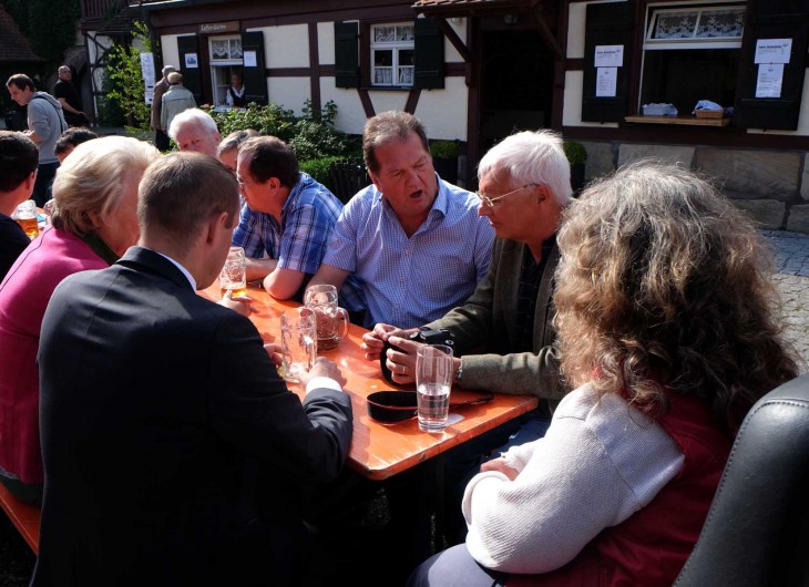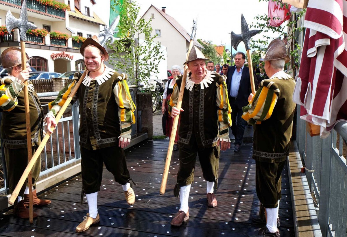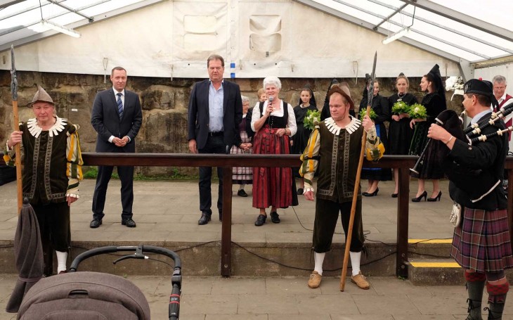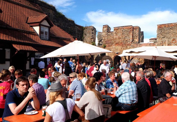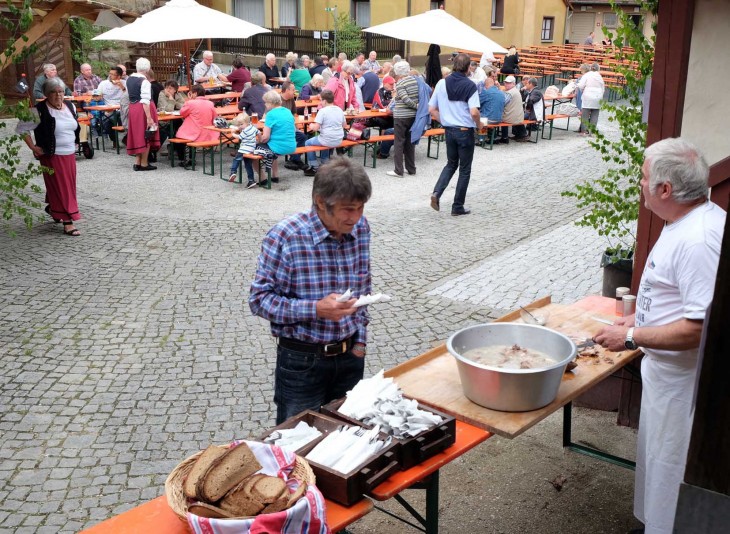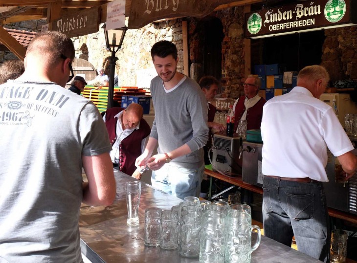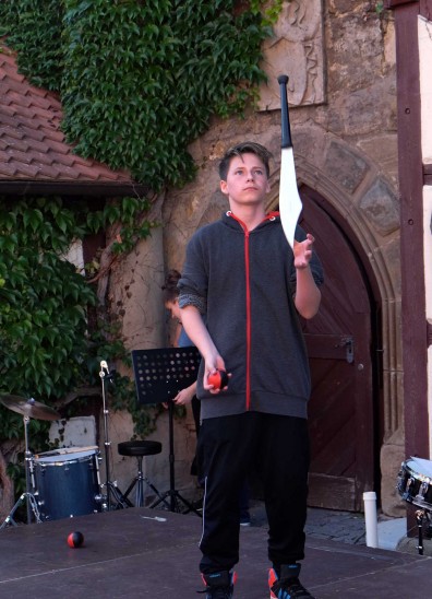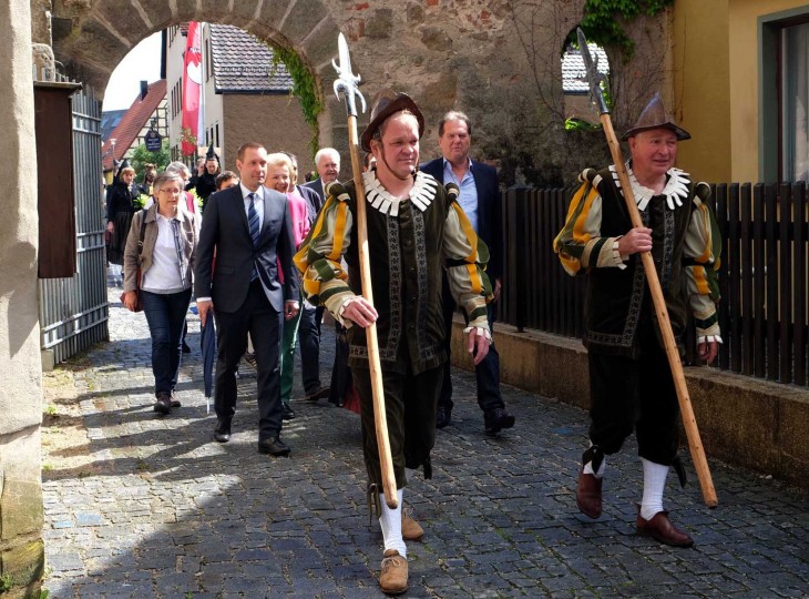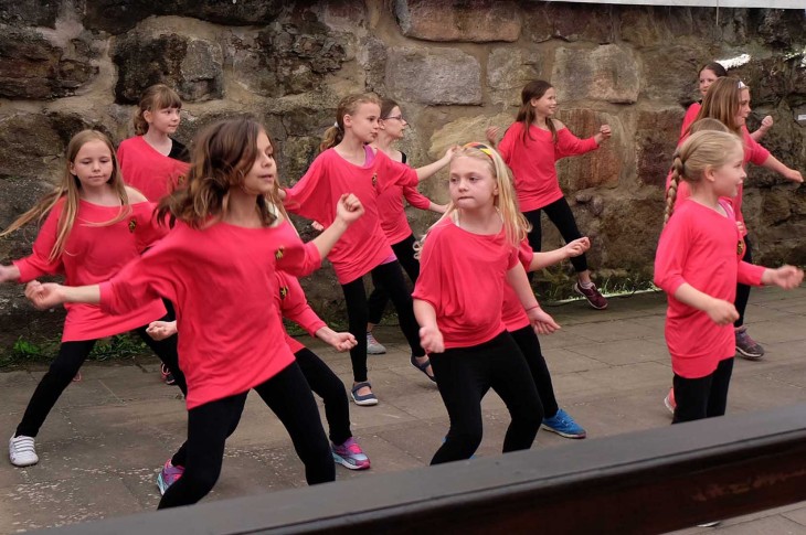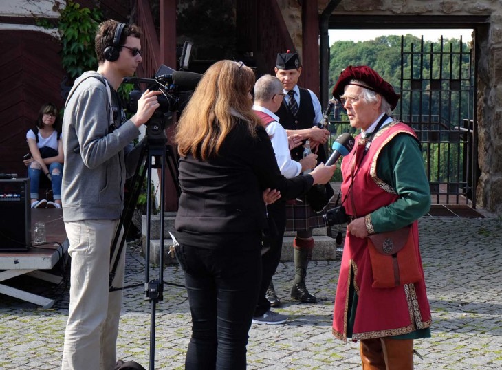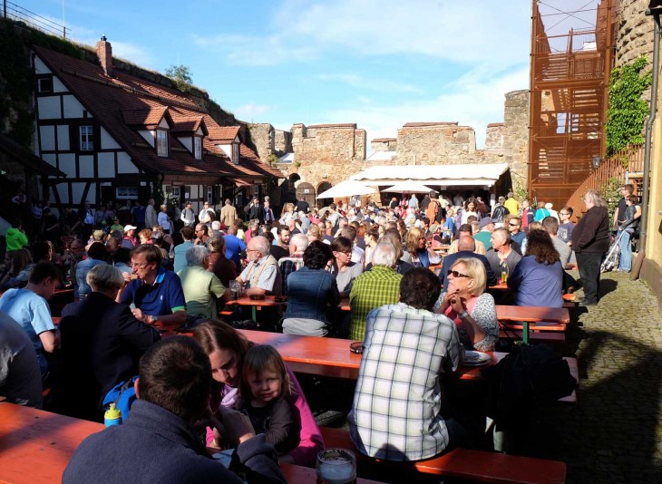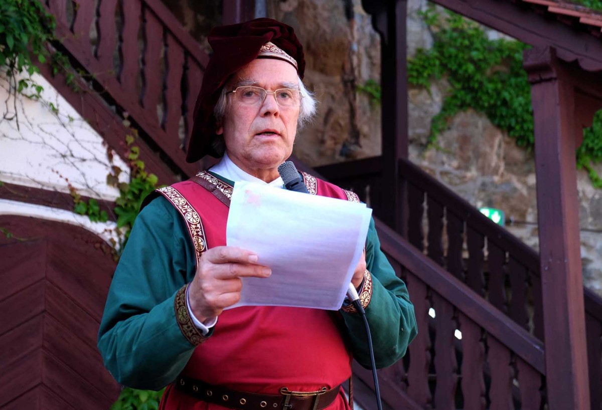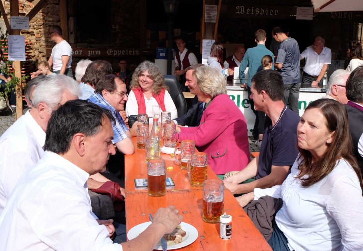 BURGTHANN – Der Burgthanner Burgverein hatte wieder zum Burgfest eingeladen. Betty Pünzner vom Burgverein kann man mit ihren Mitstreitern gratulieren, dass das Burgthanner Burgfest wieder einmal richtig gut war – nicht allein mit Essen, Trinken und Feiern, sondern mit einem Festprogramm, zu dem viele beitrugen – von den Models, die fränkische Trachten vorstellten über den meisterhaften Einradfahrer, den Jongleur und den Mikrofonzauberer bis zu den kleinen Zumba-Tänzerinnen, die sich einen Riesenapplaus beim Publikum abholten. Nicht zu vergessen der knuddelige Bär, den viele Kinder auf dem Burgfest sofort ins Herz geschlossen hatten und der zu den Klängen von Dudelsack-Spieler Thomas Schalla durch die Burg tanzte. Eröffnet wurde das Fest heuer schon vormittags mit einem Bieranstich durch Bürgermeister Heinz Meyer. Nachmittags empfingen die Burgthanner dann ihre Ehrengäste am Burgtor. Helmut Buchner, Intendant der Eppelein-Festspiele, erzählte vor großem Publikum in gereimten Versen von der Entstehung der Burg und deren weiterer Geschichte. Im kommenden Jahr bringen die Burgthanner erneut die Festspiele über den asozialen Helden Eppelein von Gailingen auf die Bühne im Burghof.