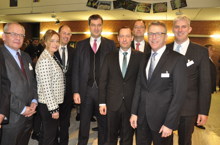 Regierungsvizepräsident Eugen Ehmann vom Bezirk Mittelfranken, Lydia Hufmann-Bisping, Laufs erster Bürgermeister Benedikt Bisping, Finanzminister Markus Söder, Landrat Armin Kroder, Laufs zweiter Bürgermeister Norbert Maschler, Bürgermeister Franz Stahl aus Tirschenreuth und Laufs dritter Bürgermeister Thomas Lang.2016/01/Neujahrsempfang-Lauf-2016-016-e1453133063341.jpg