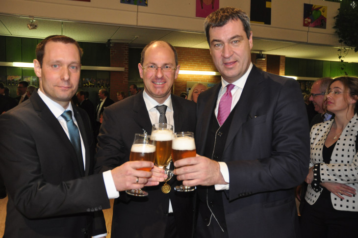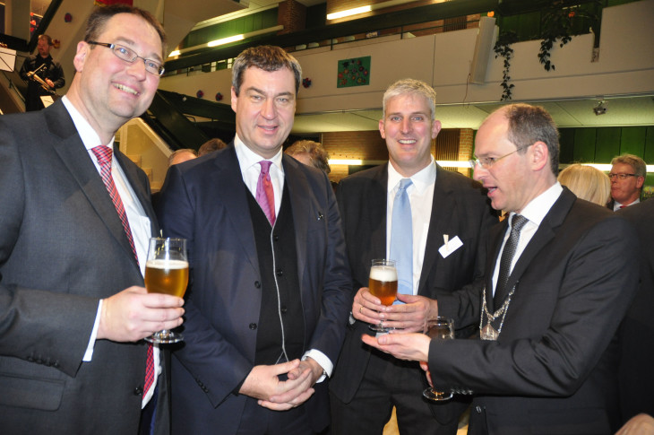 Stoßen gemeinsam mit dem "Karlsbier" an: Landrat Armin Kroder, Laufs Bürgermeister Benedikt Bisping und Finanzminister Markus Söder.2016/01/Neujahrsempfang-Lauf-2016-020.jpg