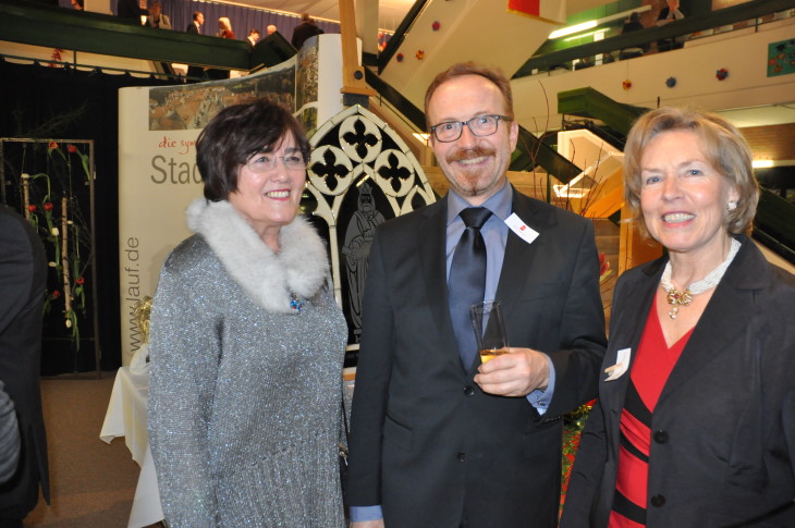 Die beiden Künstlerinnen Gerda Carina Hederer (links) und Heidi Tratz umrahmen Otfried Bürger (Öffentlichkeitsarbeit Sparkasse und Vorsitzender der AG Lauf des Kreisjugendrings).2016/01/Neujahrsempfang-Lauf-2016-028.jpg