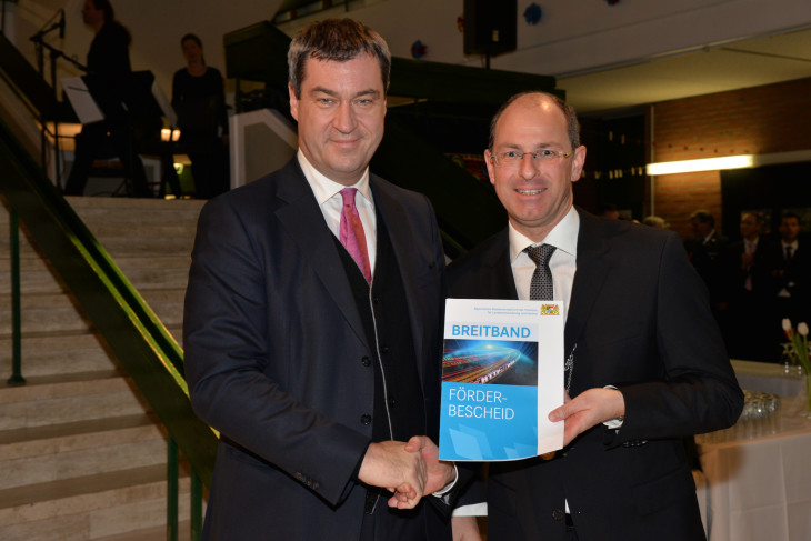 Finanzminister Markus Söder überreicht Laufs Bürgermeister Benedikt Bisping den Breitband-Förderbescheid.2016/01/Neujahrsempfang-Lauf-2016-036.jpg