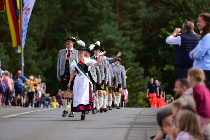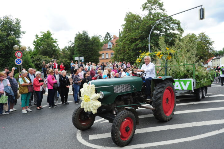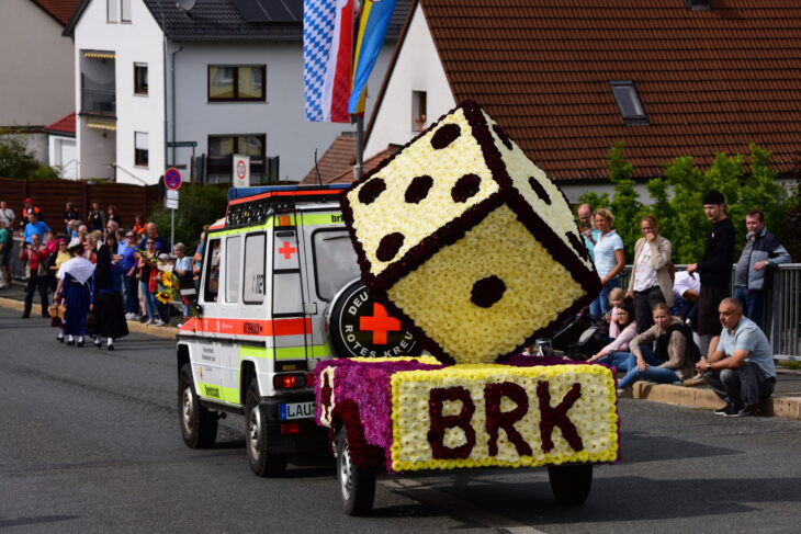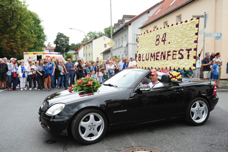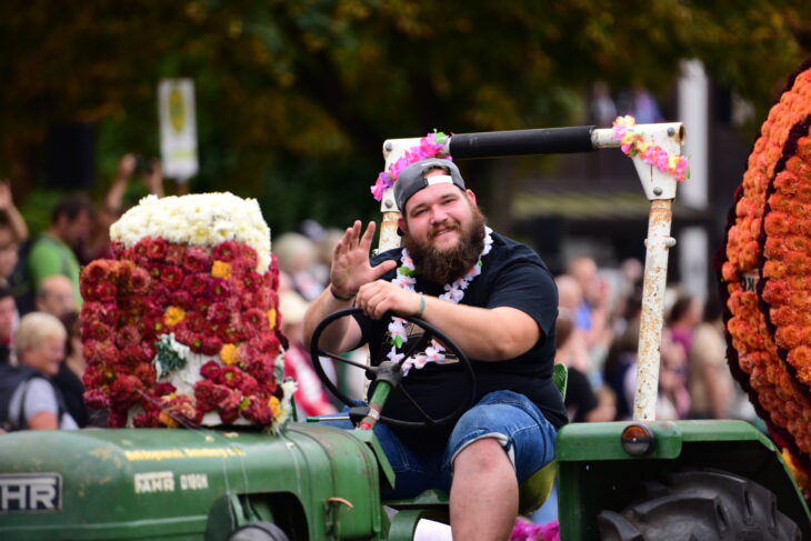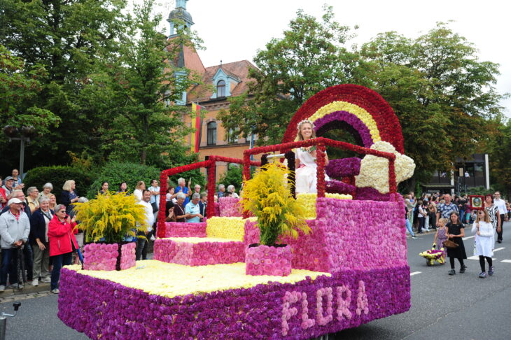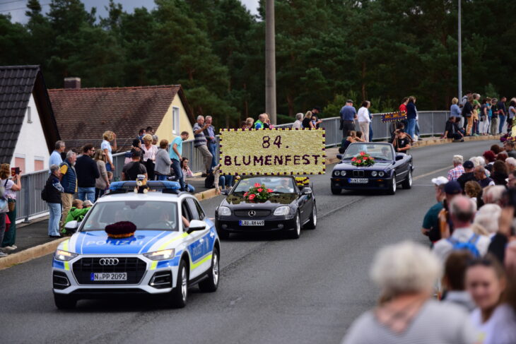 Auch wenn der Himmel wolkenverhangen war: Die Röthenbacher blieben bei ihrem 84. Blumenfest trocken. Und deutlich mehr Zuschauer als im Vorjahr säumten die Straßen – damals waren die Veranstalter des Vereinskartells von 20.000 bis 25.000 Besuchern ausgegangen. Zu sehen waren in diesem Jahr über 30 Marschgruppen und 19 mit Dahlien geschmückte Motive. Die Blumen für die Traditionsveranstaltung, die auf eine Ernteschau im Jahr 1929 zurückgeht, kommen aus den Niederlanden. Rund 330.000 wurden für die Wagen verarbeitet. Angeführt wurde der Zug durch Röthenbach von Emily Schätz auf dem Wagen des Kleingärtnervereins Flora. Für die 19-Jährige war es ihre Premiere als Blumenkönigin, auch wenn sie schon Erfahrung als Christkind hat. Moderiert wurde der Festzug erstmals von dem Gospelsänger Oliver Schott aus Schwaig. (Fotos: Andreas Sichelstiel)