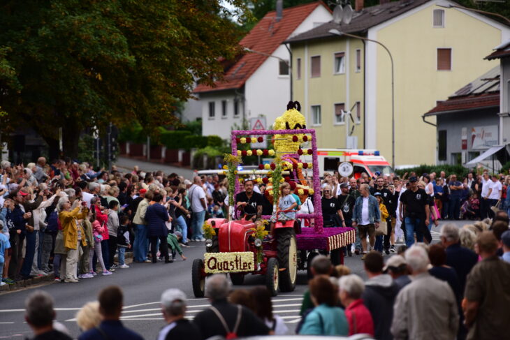 Die „Quastler“ nahmen sich mit ihrem Motiv selbst auf die Schippe: „Scho a bissl vermessen“ (16.500 Blumen) war eine Anspielung auf den Festzug 2023, als das Motiv des Vereins nicht unter die Brücke in der Grünthalstraße passte.2024/08/DSC_8493-scaled.jpg