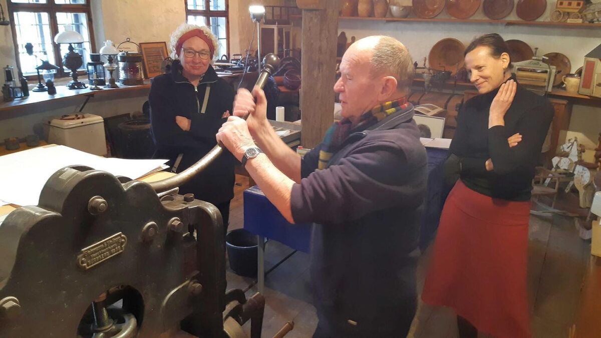 In einem kurzen „Lehrgang“ zur Lithografie haben Besucher des Deutschen Hirtenmuseums die Gelegenheit, sich in der Kunst des Steindrucks zu versuchen: Unter fachkundiger Anleitung des Künstlers Christoph Gerling können Besucherinnen und Besucher einen Stein bezeichnen und davon einen Druck an der historischen Presse No. 98 der Firma Steinmesse & Stollberg aus Nürnberg erstellen – und ihr Werk natürlich mit nach Hause nehmen.