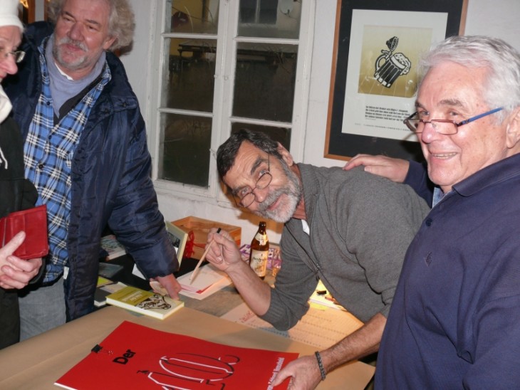 HERSBRUCK – Sobald die Tür des kleinen Baus hinter der Hersbrucker Bücherwerkstätte aufging, entwich eine Dampfwolke in die Kälte. Der Grund: der bullige Ofen – und die dicke Zigarre von Eckhard Henscheid. Der Satiriker, Autor und Sprachpfleger war am Samstag nach Hersbruck gereist, um die 40. Ausgabe des berühmten Kalenders, diesmal bereichert mit seinen zwölf Denkversen, zu signieren. Der Andrang war riesig. Michael Gölling, einer der Drucker und Erschaffer dieser kleinen Meisterwerke, ließ sich in gewohnter Art aber nicht aus der Ruhe bringen. Ein Bierchen neben sich stehend packte er Kalender um Kalender ein, doch die Schlange wollte nicht kürzer werden. Was definitiv auch an Henscheid lag. Der begnadete Denker und Formulierer hatte versprochen, Fragen zum Leben zu beantworten. Dazu kam es aber selten. Denn Henscheid, der um 15 Uhr mit der Signierstunde begann, hatte selbst immer die erste Frage: „Wie spielt der Club?“ Oder später: „Wie hat der Club gespielt?“ Oder viel später: „Darf das denn wahr sein?“ Foto.: S. Will