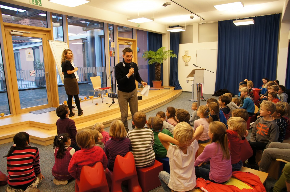 Währenddessen bereiteten sich die Kinder unter Anleitung von Christian Seltmann auf ihre Aufgabe vor: Denn sie waren für die Hintergrundgeräusche des geplanten Hörspiels zuständig. Mit einem unheimlichen Rauschen, dem Heulen von Wölfen und Krächzen von Raben machten sie die Wildnis, durch die der kleine Ritter reiten musste, hörbar.