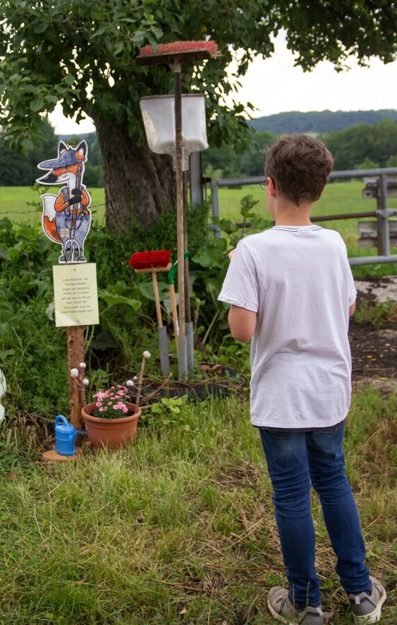 Nun sind die Füchse Teil eben dieser vier Kilometer langen Spazierrunde. Sie sind auf Stelen geschraubt und begrüßen an 14 Stationen zu unterschiedlichen Themen die Familien, die Hauptzielgruppe des Wegs sind. Auch die Themen seien aus der Situation im vergangenen Jahr entstanden – sie sollen Anregungen schaffen, etwas Schützenswertes für die wunderschöne Natur zu tun, so die Zeichnerin.
