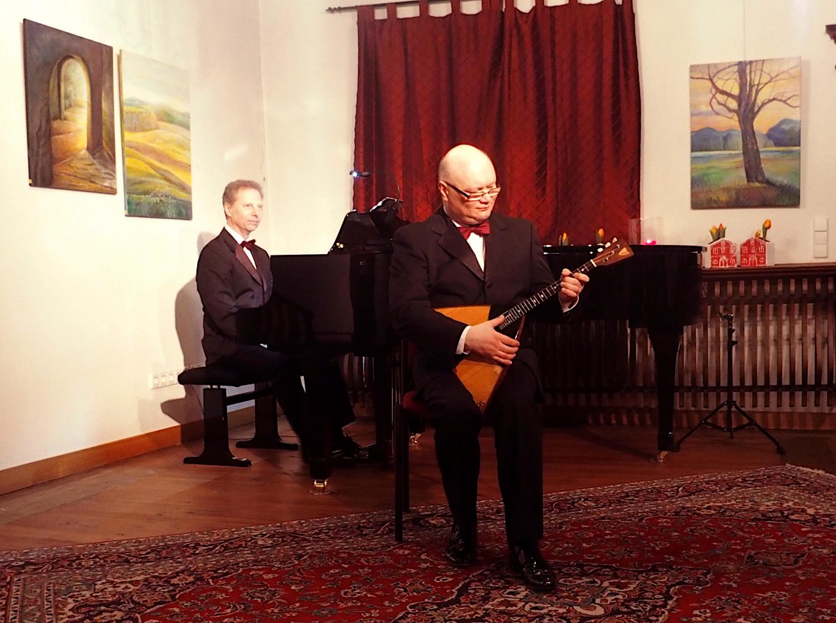 Das Konzert begann mit einer Polonaise von Vasilly Andreyev, gefolgt von einer Sonate von Domenico Scarlatti und einer Calabrese von Antonio Bazzini, mit denen die beiden Künstler das Publikum sofort in eine furiose, ganz ungewöhnliche Hörwelt entführten. Auch eine russische Jazz-Fantasie und Variationen über ein russisches Volkslied zeigten, wie vielseitig dieses Instrument zum Klingen gebracht werden und welch variablen Töne man ihm durch gleichzeitiges Zupfen und Greifen entlocken kann.