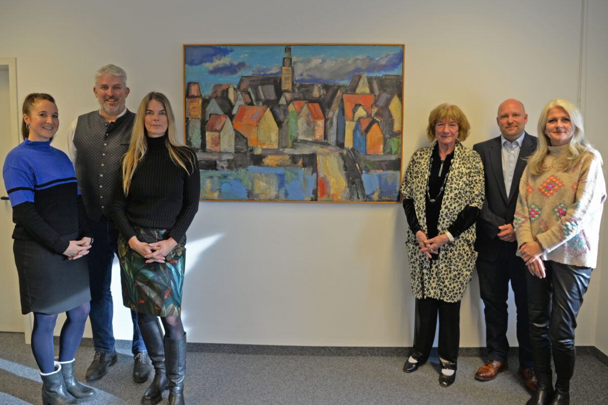 Dr. Mirjam Pekar-Milicevic von der Wirtschaftsförderung der Stadt, Bürgermeister Thomas Lang, Dr. Ina Schönwald, die Leiterin des Laufer Stadtarchivs, Hedi Seebode, Michael Meye, der Leiter des Kulturamts und seine Stellvertreterin Anja Schwemmer (von links). | Foto: Andreas Kirchmayer/Stadt Lauf2023/12/Kolbe-Gemaelde-Rathaus-Foto-Kirchmayer-scaled.jpg