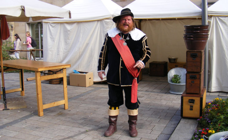 Zunächst nimmt er allerdings nur als Zaungast an dem bunten Treiben teil. „Selbst aktiv geworden bin ich erst relativ spät“, erinnert sich Winkelmann. Zum ersten Mal streckt er seine Fühler als 27-Jähriger bei den Landsknechten Zeh aus. Ein Jahr später ist er fest mit dabei und schlägt zusammen mit seinen Spießgesellen das Lager am Oberen Markt auf, lümmelt als lebende Kulisse malerisch am Feuer herum, verlangt Pflasterzoll und erfreut sich des Lagerlebens. Seit 2012 ist Winkelmann stolzer Hauptmann der Landsknechte Zeh.