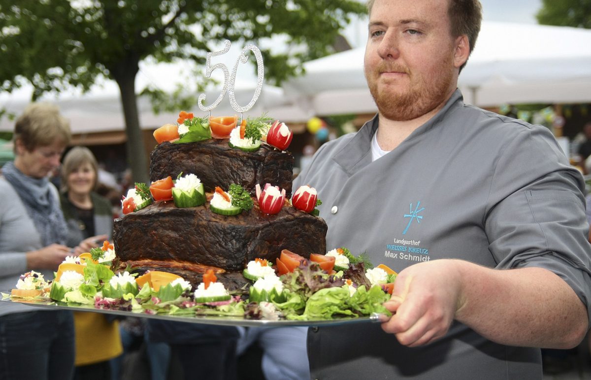 Die Jubiläumstorte stiftete Metzgermeister Maximilian Schmidt vom Landgasthof „Weißes Kreuz“ aus Altenthann – zwölf Kilogramm, dreistöckig, liebevoll verziert und ganz aus Leberkäse. | Foto: Dorothee Krätzer2019/05/Schwarzenbruck-50-MondMarkt_Leberkoestorte_Schmidt_5-2019_69.jpg