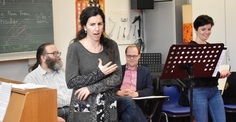 „Im Opernhaus werden Geschichten mit Musik erzählt“, sagte Theaterpädagogin Pilhofer zu den neugierigen Kindern und erklärte ihnen Fachbegriffe wie Arie und Duett sowie die verschiedenen Stimmfächer. Annette Kroll singt zum Beispiel Sopran, Raquel Luis Alt, Sebastian Köchig ist Tenor und Rüdiger Krehbiel Bass. Alle vier haben Gesang studiert und schon als Kind in einem Chor gesungen.