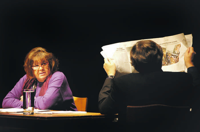 Die lose Aneinanderreihung von Minidialogen aus der Feder des Nürnberger Lyrikers und Autors hat es in sich, das zeigt schon die Tatsache, dass zwölf der insgesamt 25 Szenen, die Kusz und Cornelissen im DHT interpretieren, den Titel „Nahkampf“ tragen. Und der darf, nein, muss so im wörtlichen Sinne verstanden werden. Denn die Dialoge und Monologe kommen an diesem Abend Schlag auf Schlag und landen wie giftige Pfeile direkt im Publikum, das mit einer Mischung aus Faszination und Abwehr den beiden auf der Bühne da lauscht, die sprachlich die Messer wetzen, bis der Schlaganfall kommt.