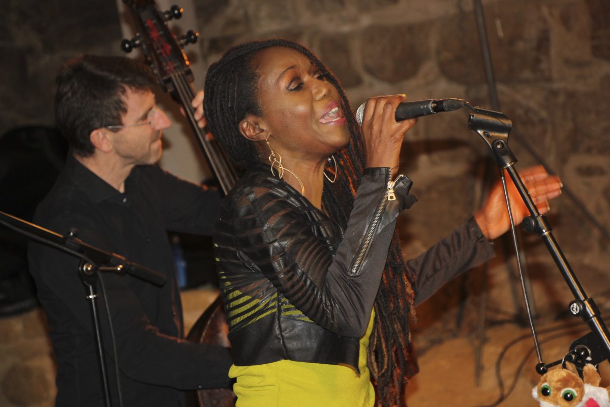 Mit ihrer kraftvollen und dennoch sensiblen Stimme beherrscht die zierliche Sängerin mit den hüftlangen Rastalocken aber sofort die Szene, nachdem das Intro als Instrumental auf die Solistin vorbereitet hat. Dann zeigt sie in den Songs, die hauptsächlich aus ihrer Feder stammen, dass sie die gesamte Palette an Klangfarben, Höhen und Tiefen, mühelos beherrscht, sehr professionell und gleichzeitig herrlich unangestrengt und natürlich. Hier verbinden sich Talent und Können aufs Schönste, nichts wirkt aufgesetzt, Mimik und Gestik sind authentisch. Gleichzeitig verrät die Künstlerin immer wieder ihre eigene Leidenschaft, wenn sie von den Songs und ihren Inhalten erzählt und ihre Begeisterung vom Auftrittsort in dem alten Burggemäuer beinahe demütig immer wieder beteuert und schließlich schnell ein paar Fotos mit dem Handy schießt. Die Sympathien der zahlreich erschienenen Zuhörer gewinnt sie daher nicht nur wegen ihrer phantastischen Performance und ihrer umwerfenden Optik von Anfang an. Da tut sie sich natürlich leicht, das Publikum zum Mitklatschen und Refrainsingen zu animieren.