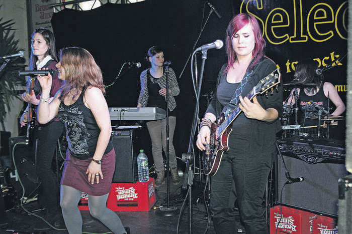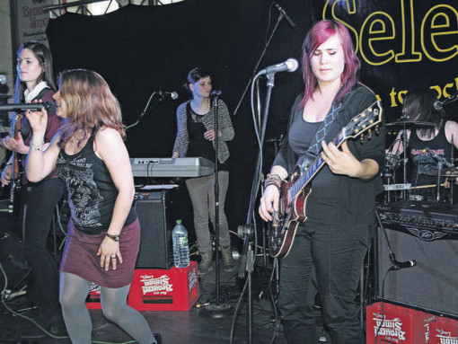 Schon nach einer kurzen Umbauphase stand Select auf der Bühne. Select sind fünf junge Frauen aus dem Nördlinger Rieß die sich einst als Schulband gefunden haben. Wie kleine Kometen schlug die unbekümmerte Art Musik zu machen beim Publikum ein. Spaß und Freude an der Musik waren ab den ersten Tönen spürbar. Steffi Deubler, Jessy Heinrich und Sarah Fall wechseln sich an den Gitarren stets ab und sorgen für einen vielstimmigen Gesang. Aktuelle Rocksongs ergänzen das abwechslungsreiche Programm. Da die Band keine feste Bassistin in Ihren Reihen hat wechselte dieses Instrument ständig durch die Reihen. Stetige Antreiberin am Schlagzeug ist Lisa Mittring. Auch wenn die Halle zu diesem Zeitpunkt noch nicht voll gefüllt war, konnte Select für beste Stimmung sorgen. Höhepunkt des Auftritts war ein eindrucksvolles Medley aus den bekanntesten Songs der australischen Rocker AC/DC. Ein musikalischer schwäbelnder Leckerbissen, mit dem niemand gerechnet hat, macht Lust auf mehr.