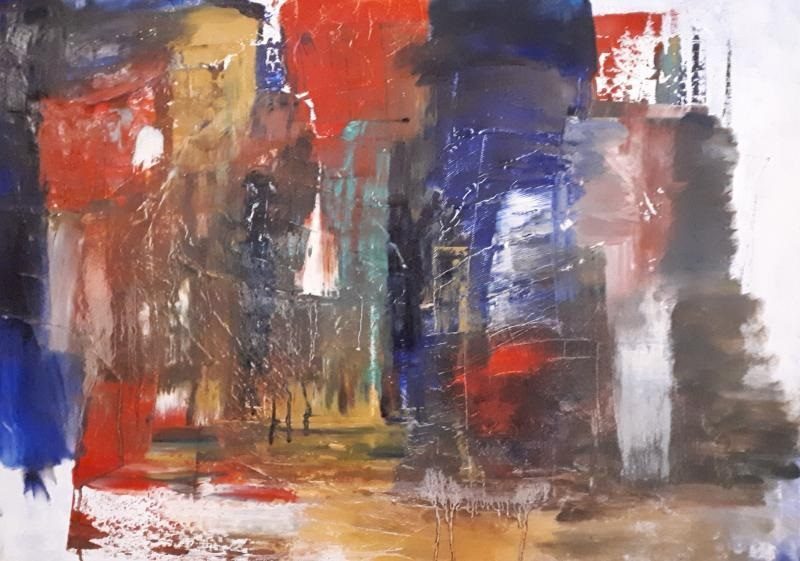 Bei „Stadt im Regen“ lässt Anke Hahn in ihrem Ölbild Wolkenbruch und Pinsel freien Lauf. | Foto: privat2019/06/Stadt.jpg