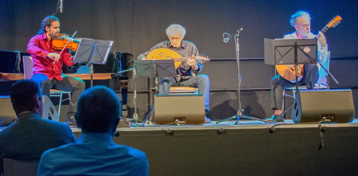 Im zweiten Teil des Abends saßen sehr unterschiedliche Künstler auf der Bühne. Ein argentinischer Gitarrist, ein deutscher Oud-Spieler ein junger syrischer Mann mit seiner Viola. Luis Borda hat gemeinsam mit Roman Bunka und Ehab Abou Fakhr das Trio „Orientacion“ zusammengeschweißt.