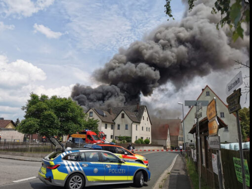 Bereits bei der Anfahrt der Feuerwehren stieg ein riesiger Rauchpilz in den Himmel, die Flammen schlugen hoch aus dem Gebäude. Die Scheune stand in Vollbrand, durch die enge Bebauung und die massive Wärmestrahlung hatte das Feuer bereits auf drei Wohnhäuser, Garagen und Carports übergriffen. „Unser wichtigstes Ziel war es, die angrenzenden Gebäude zu retten“, erzählt Oliver Heinecke, Kommandant der Laufer Feuerwehr, der von einer „massiven Hitzeentwicklung“ spricht.