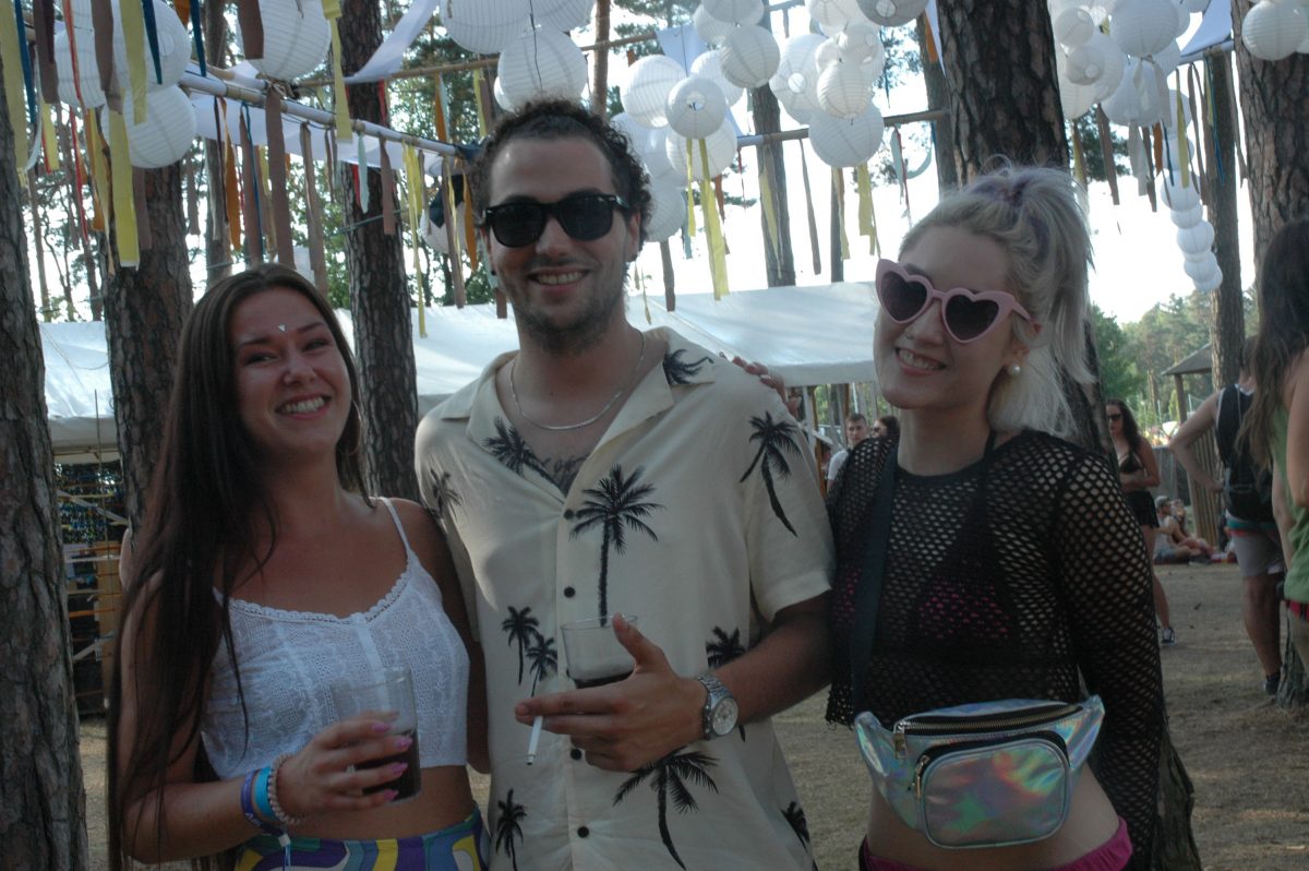 Unter den schattenspendenden hohen Bäumen fanden sich jetzt viele chillige Sitzplätze auf Holzpaletten und Gymnastikbällen. Oder man legte sich in die kunterbunte Hängmatte, die anstelle der Schaukeln am Schaukelgerüst befestigt war. Aus dem Rutschturm des Spielplatzes steigen Nebelwolken der dort platzierten Nebelmaschine und vermischen sich mit dem Zigarettenrauch der Besucher. Und zwischen den Bäumen flatterten bunte Bänder und wehten weiße Luftballons über der Tanzwiese.