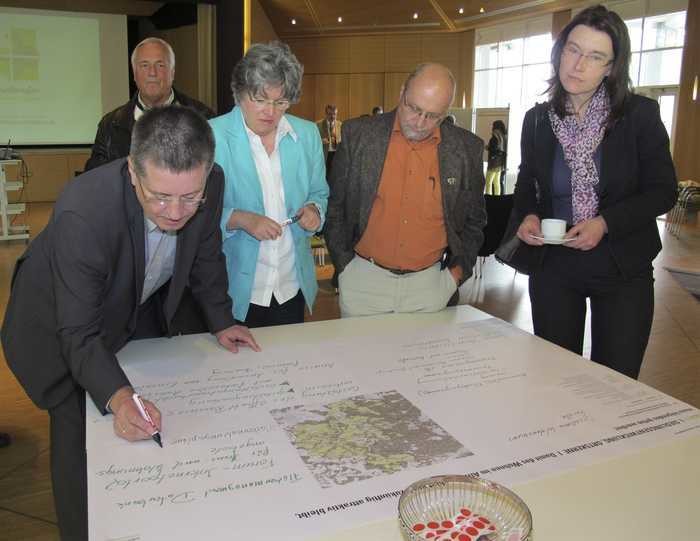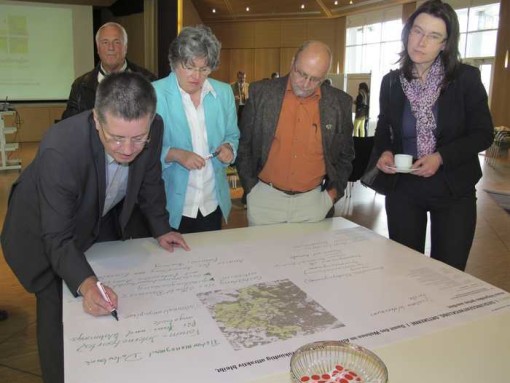 Die Bürgermeister sitzen als Gastgeber für die Arbeitsgruppen an sechs Tischen, notieren mit Filzstiften die Vorschläge der Teilnehmer auf große Papierbögen und diskutieren mit ihnen über die Ideen. Hinterher dürfen alle Anwesenden mit Stickern ihre besonderen Herzensangelegenheiten markieren. Dann werden geeignete Maßnahmen besprochen und über mögliche Träger nachgedacht.