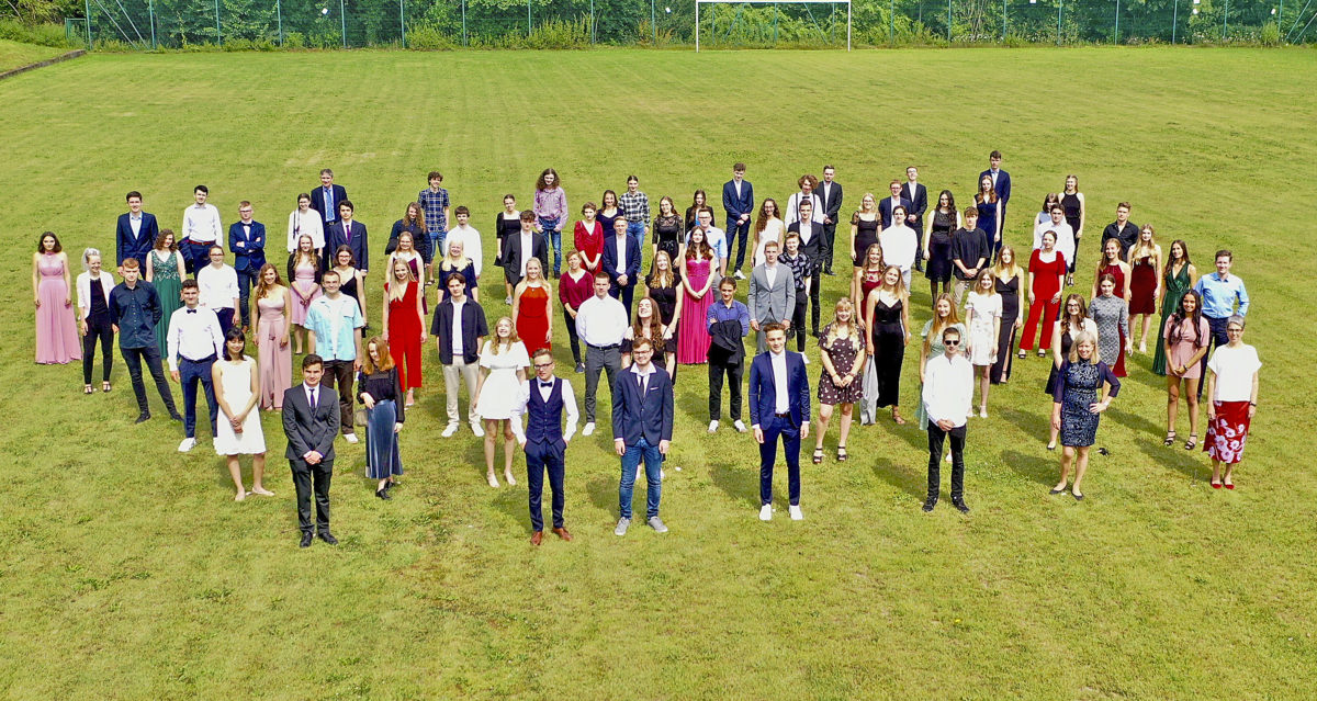 Die Ergebnisse der unter so besonderen Umständen geschriebenen Abschlussprüfung können sich sehen lassen: Der Gesamtdurchschnitt aller Zeugnisse beträgt 2,24, die beiden Jahrgangsbesten Alissa Eckstein und Thao Lyn Le erzielten beide die Traumnote 1,0. Insgesamt haben 13,1 Prozent des Jahrgangs die Note 1,5 oder besser erzielt. Nach dem Drohnenfoto ging es zum Spalierlaufen über den Pausenhof zur Verabschiedung von Lehrkräften und zur anschließenden Zeugnisverleihung in die Sporthalle der Förderschule.