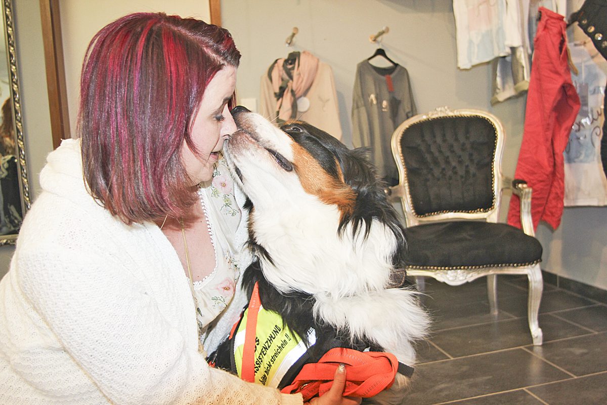 Max ist der heimliche Star des Nachmittags, in dessen Mittelpunkt eigentlich Jessica Eichhorn stehen sollte. Sie erzählt in Petra Meiers Altdorfer Boutique, wie sie das kleine Fellbündel im Alter von zehn Wochen abholte und nach Hause brachte, wie sie sich um den Welpen kümmerte, ihn stubenrein machte und großzog. Jetzt ist Max 15 Monate alt und zu einem richtig großen Hund heran gewachsen.