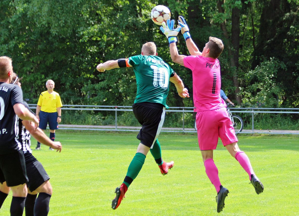 Luftduell im Neumarkter Strafraum: Röthenbachs Kapitän Christoph Stahl (links) versucht, noch vor Neumarkts Keeper Andre Pichler an den Ball zu kommen. | Foto: DV2018/05/fvroethenbachfcneumarktsued.jpg