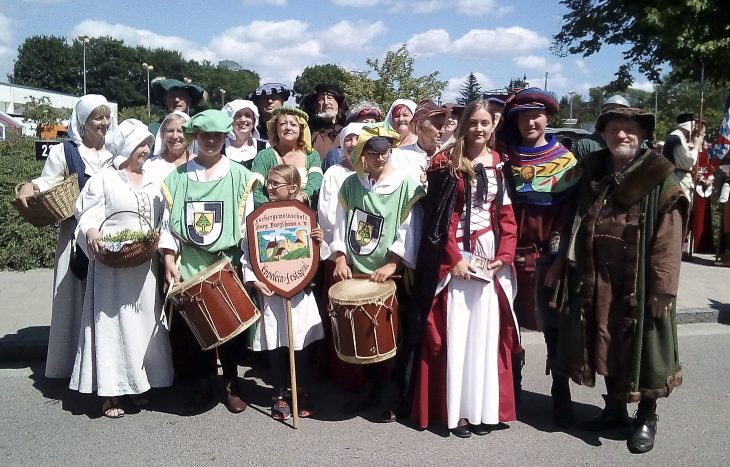 Auch eine stattliche Anzahl von Darstellern der Eppelein-Festspiele marschierte mit und verteilte im Jahr vor den Spielen Flyer für 2020. Unter den Eppeleinern war erstmals auch das neue „Traumpaar“ der Festspiele im kommenden Jahr, Eppelein Harald Franz und Agnes Lena Gebhard.