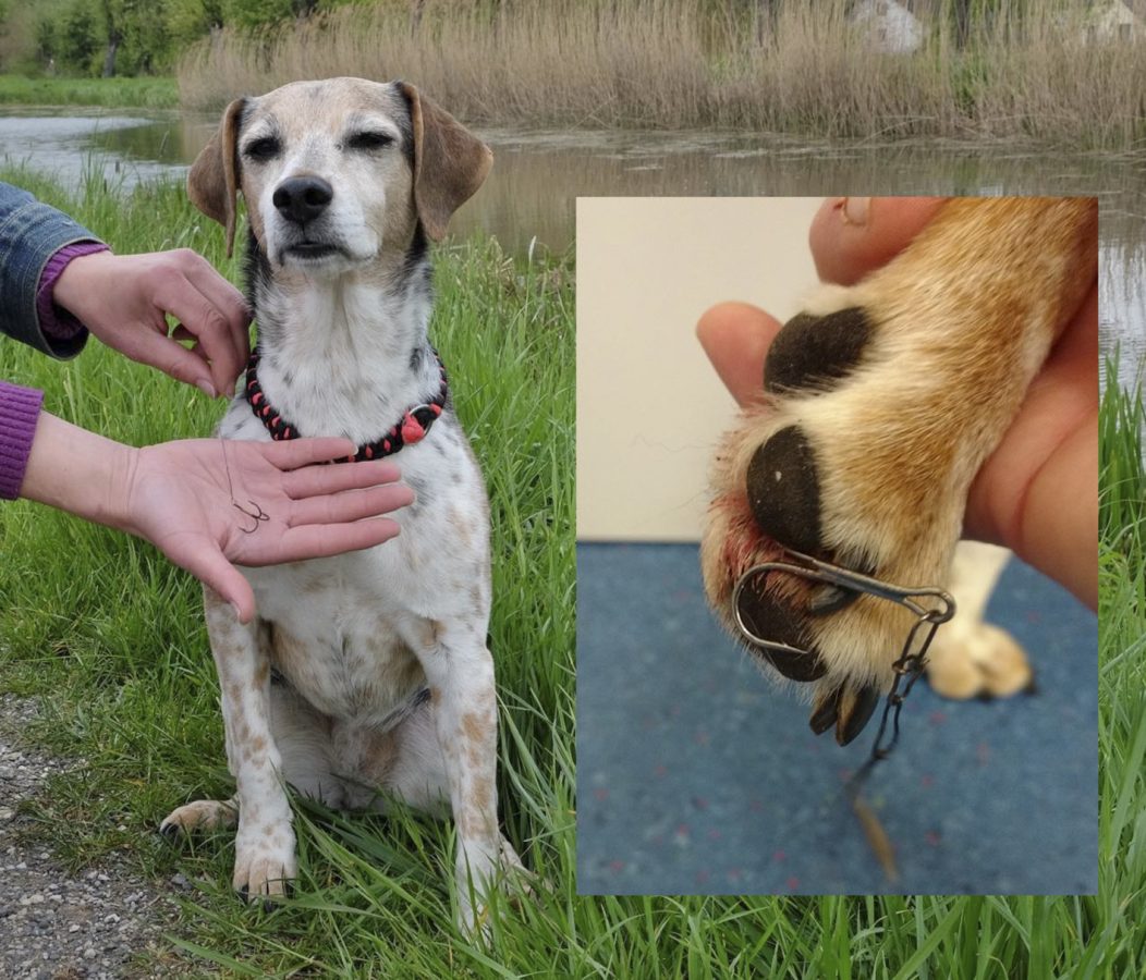 Der Grund für Arlis Alarm: Die Hündin hatte sich einen Anglerhaken in die Pfote gerammt, den Angler wohl verloren oder einfach liegen gelassen haben. Da der Drillingshaken sich derart tief in der Hinterpfote verhakt hatte, die Wunde stark blutete und der aufgeregte Hund zu kollabieren drohte, mussten die beiden den Spaziergang sofort abbrechen und eine Fahrt zum Tierarzt antreten. 60 Euro kostete die Behandlung.
