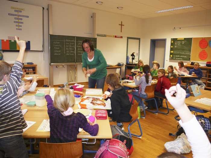EZELSDORF – Es liegen zwar ein paar Hefte auf den Schülerpulten, ein paar Stifte, aber sonstsind die Arbeitsutensilien für Drittklässler eher ungewöhnlich: Schneebesen, Schürzen, Plastikschüsseln, Tupperschalen mit Zucker, Quark und Milch. Die Zutaten werden gewogen und es liegt ein ungewöhnlich fruchtiger Duft in der Luft, der nicht allein von Apfelsaft herrührt oder von Mandarinenpüree.
