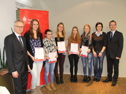Die „Spekulatius“-Jungs bei der Siegerehrung mit Lehrerin Barbara Titze (2. v.r.), Michael Kläver, stellvertretendes Vorstandsmitglied der Sparkasse Nürnberg (l.), sowie Thomas Häußler, Leiter der Sparkassen-Geschäftsstelle Röthenbach.2015/01/Planspiel_Bo__rse_Spekulatius_gsg_ro__th.jpg