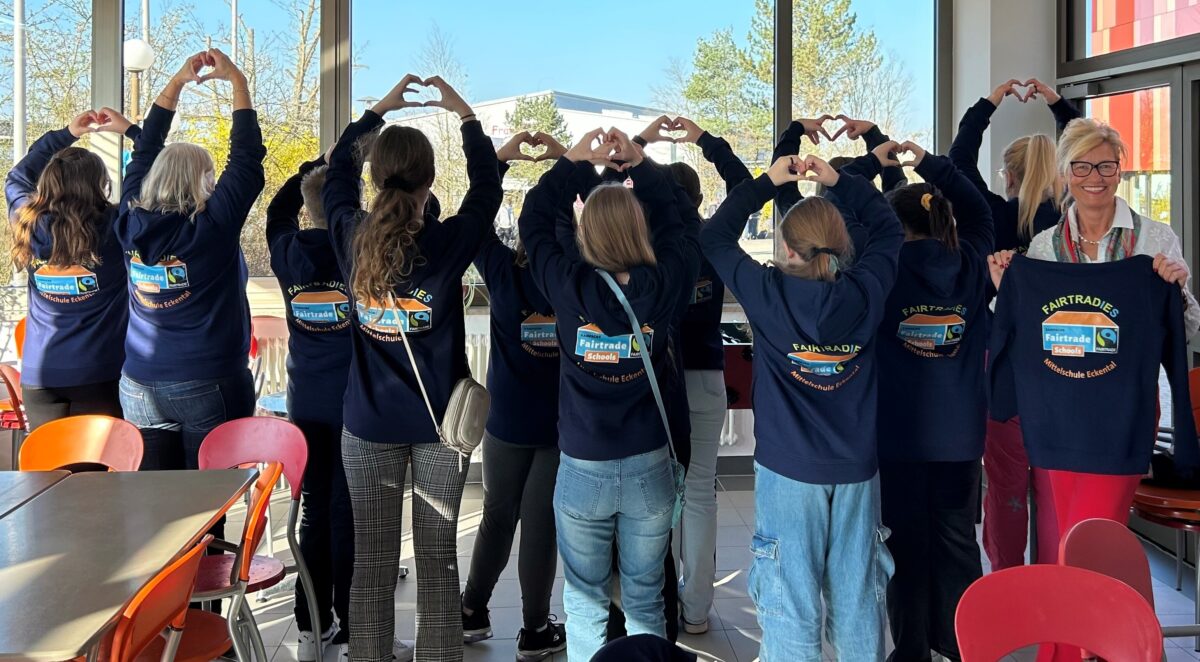 Eckentals Bürgermeisterin Ilse Dölle überraschte das Schulteam „Fairtradies“ nun als Dankeschön mit Hoodies, die sie während des wöchentlichen Schüler-Cafés überreichte: „Ich freue mich sehr, dass die Lehrer der Mittelschule so viele Schülerinnen und Schüler für dieses Thema begeistern konnten. Man spürt, mit welcher Freude alle dabei sind und wie leicht es ist, den fairen Gedanken umzusetzen.“ Sie sei überzeugt, dass dieses Team als Multiplikator sowohl in der Schule, aber auch zu Hause viel für den fairen Gedanken erreichen könne.