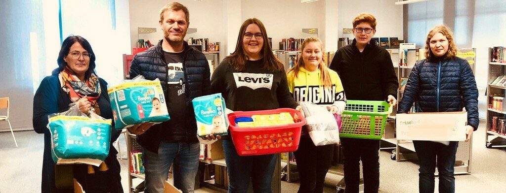 Der Elternbeirat der Schule hat sich sofort beteiligt: In Verbindung mit dem Rewe Markt in Hersbruck hat der Elternbeirat Babynahrung, Windeln und Fruchtriegel besorgt. Kassier Bernd Rupprecht und Beisitzerin Andrea Zimmermann freuten sich, diese an Schulleiter Thomas Zankl und Lehrerin Anja Schubert als Kontaktperson zu den Johannitern und den fleißigen Helfern der Schule zu übergeben.