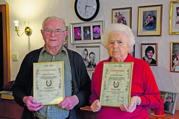 Ludwig und Lidwina Wolfsteiner mit ihren Urkunden zur 50-jährigen Mitgliedschaft im Zeidler- und Volkstrachtenverein. | Foto: Klara Rocholl2020/03/Feucht-Vereinsmeister-Wolfsteiner-Urkunde.jpg