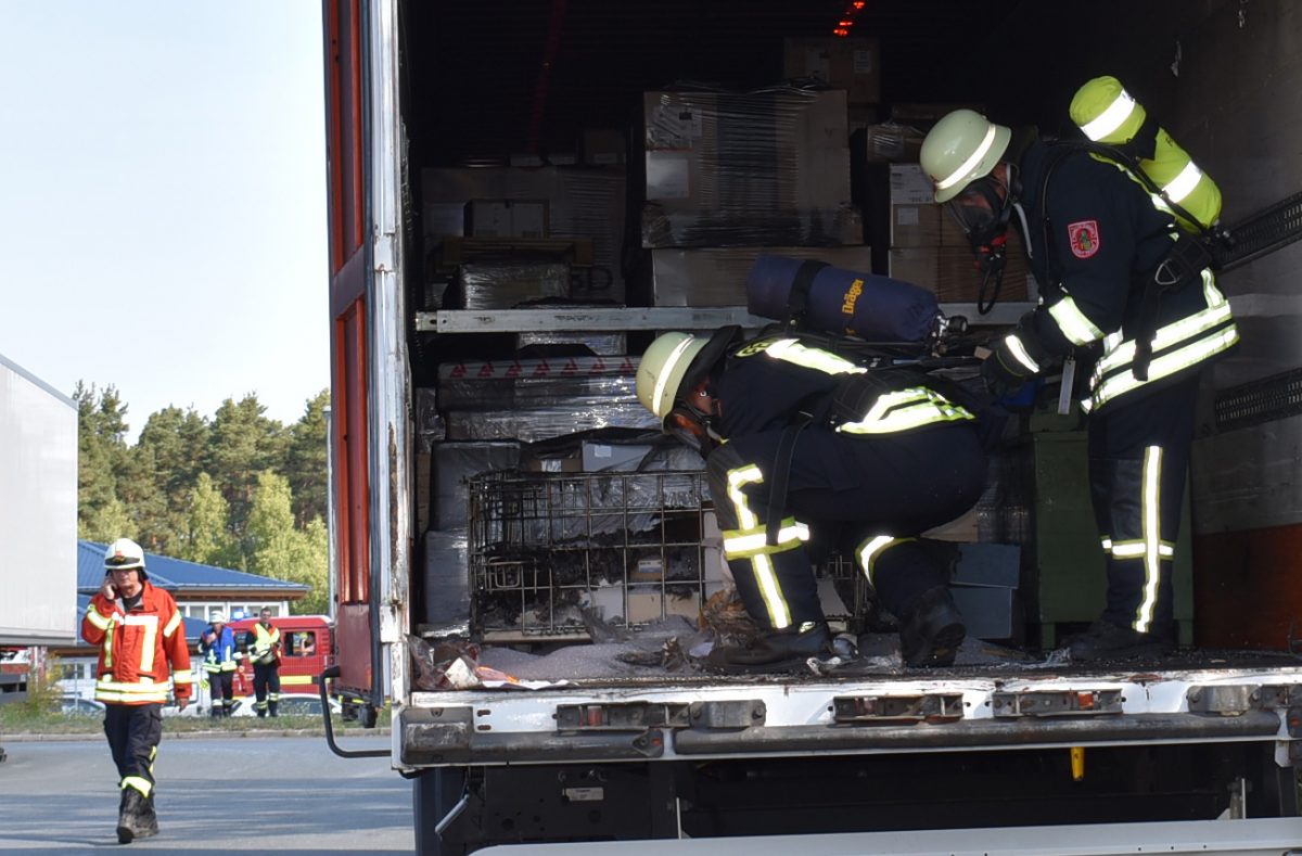 Auf dem Gelände eines Losgistikunternehmens Am hohen Bühl hatten Mitarbeiter beim Entladen eines Lastwagens Brandgeruch bemerkt. Feuerwehr und Polizei wurden gerufen, da zunächst Sorge bestand, dass Gefahrgut geladen sein und in Brand geraten könnte. Die Ursache war jedoch nach kurzer Suche gefunden, die Einsatzkräfte gaben Entwarnung: In dem mit Konsumgütern und Fahrzeugteilen beladenen Lastwagen kokelte ein Behälter mit Kunststoffgranulat. Der Brand war schon bei Ankunft der Feuerwehr erloschen. Die Brandursache ist bis dato ungeklärt. Insgesamt entstand laut Polizeipräsidium ein Sachschaden von rund 1000 Euro. Verletzt wurde niemand.