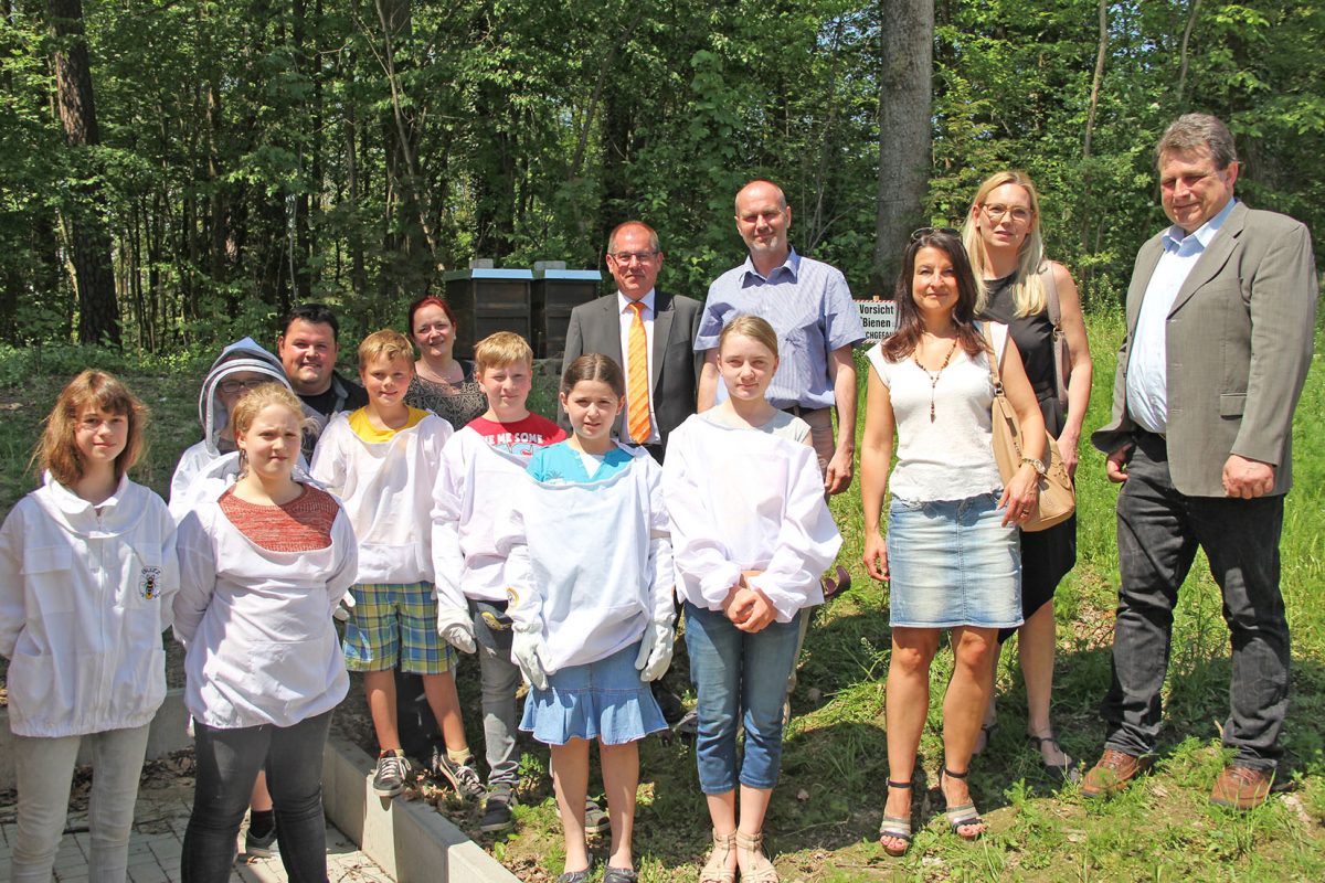 FEUCHT – Dank der umtriebigen Umweltklasse und ihres Lehrers Stefan Kukula summt und brummt es seit Kurzem vor dem Wäldchen hinter dem Schulgebäude der Realschule Feucht. Zwei Bienenvölker siedelten die jungen Imker der Bienen-AG hier an. Im Kreise ihrer Unterstützer weihten sie ihr neues Immendomizil ein. Die Nachbarn freuen sich schon auf den ersten Honig.