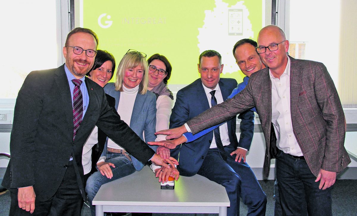 Ottfried Bürger, Katja Britting, Annette Zimmermann, Solveig Grunow, Armin Kroder, Martin Schwarzott und Bernd Hölzel geben den Startschuss für die neue Flüchtlings-App (von links). | Foto: Walter2017/11/Lauf-Integreat-App.jpg