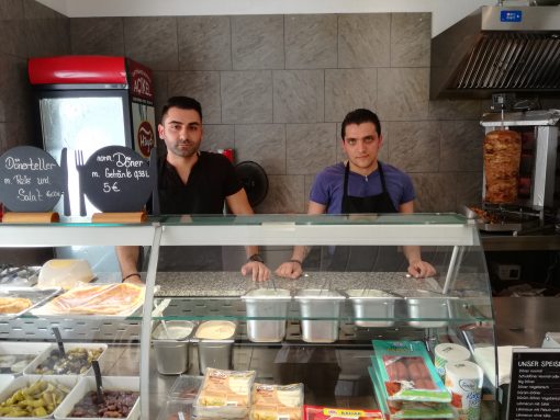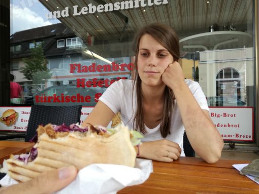 “Ich kann mir jetzt auch was Erfrischenderes vorstellen als einen Döner. Aber besser als nix!“, sagt mein Kollege Christian Geist und beißt in die dicke Teigtasche. Gemein! Ob ich auch was bestellen möchte, fragt Adnan Can. „Nein. Ich faste heute“, erzähle ich. „Denkt ihr, ich schaff das?“, frage ich ihn und seinen Kollegen. „Ich glaube nein“, sagt Adnan. „Noch zehn Stunden? Nein. Ich geb‘ dir noch fünf!“ Die beiden fasten nicht. „Geht nicht hier im 50 Grad heißen Laden. Ich muss normal arbeiten“, sagt Adnan. „Im Koran steht auch, dass es schlecht ist, seinen Körper kaputt zu machen.“ Sein Kollege nickt. „Ein Freund hat gefastet und trotzdem Fußball gespielt. Der ist dann umgekippt und musste ins Krankenhaus“, erzählt er. Geht das, dass man das Fasten einfach sein lässt? Ich werde den Imam fragen!