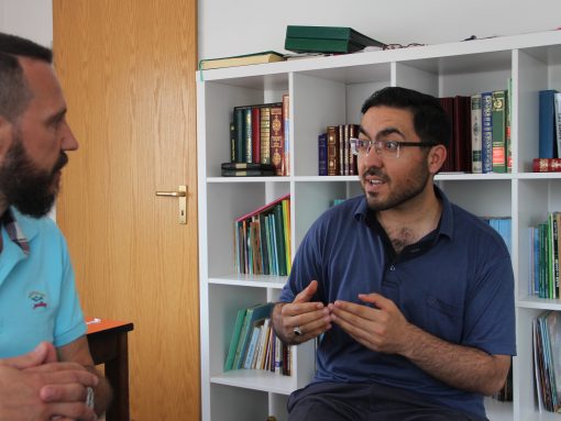 Musa Yilmaz vom islamischen Kulturverein begrüßt mich auf dem Parkplatz neben dem schönen Sandsteinhaus an der Rascher Straße, in dem sich die Moschee befindet. Er bietet mir sogleich das „Du“ an. Auf einem Schild an der Hauswand steht, dass es die Moschee bereits seit 1984 gibt. Die meisten Muslime, die hier her kommen, sind Türken. Auch Imam Gökhan Korkmaz kommt aus der Türkei, vor neun Monaten ist er nach Altdorf gekommen. Er begrüßt mich an der Tür. Beide, Musa und der Imam, sind jünger, als ich sie mir vorgestellt habe. Der Imam trägt Brille, einen kurzen Bart und lächelt unentwegt. Weil er noch nicht so gut deutsch spricht, übersetzt Musa.