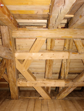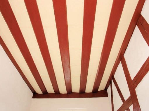 Die abgehängten Decken gehören der Vergangenheit an, die alten Balken erstrahlen im neuen alten Glanz – zum Teil wurden sie lediglich gesäubert und die alte Farbe freigelegt. Das Fachwerk wurde ersetzt. Heizungsrohre und Kabelgeflechte sind verschwunden.