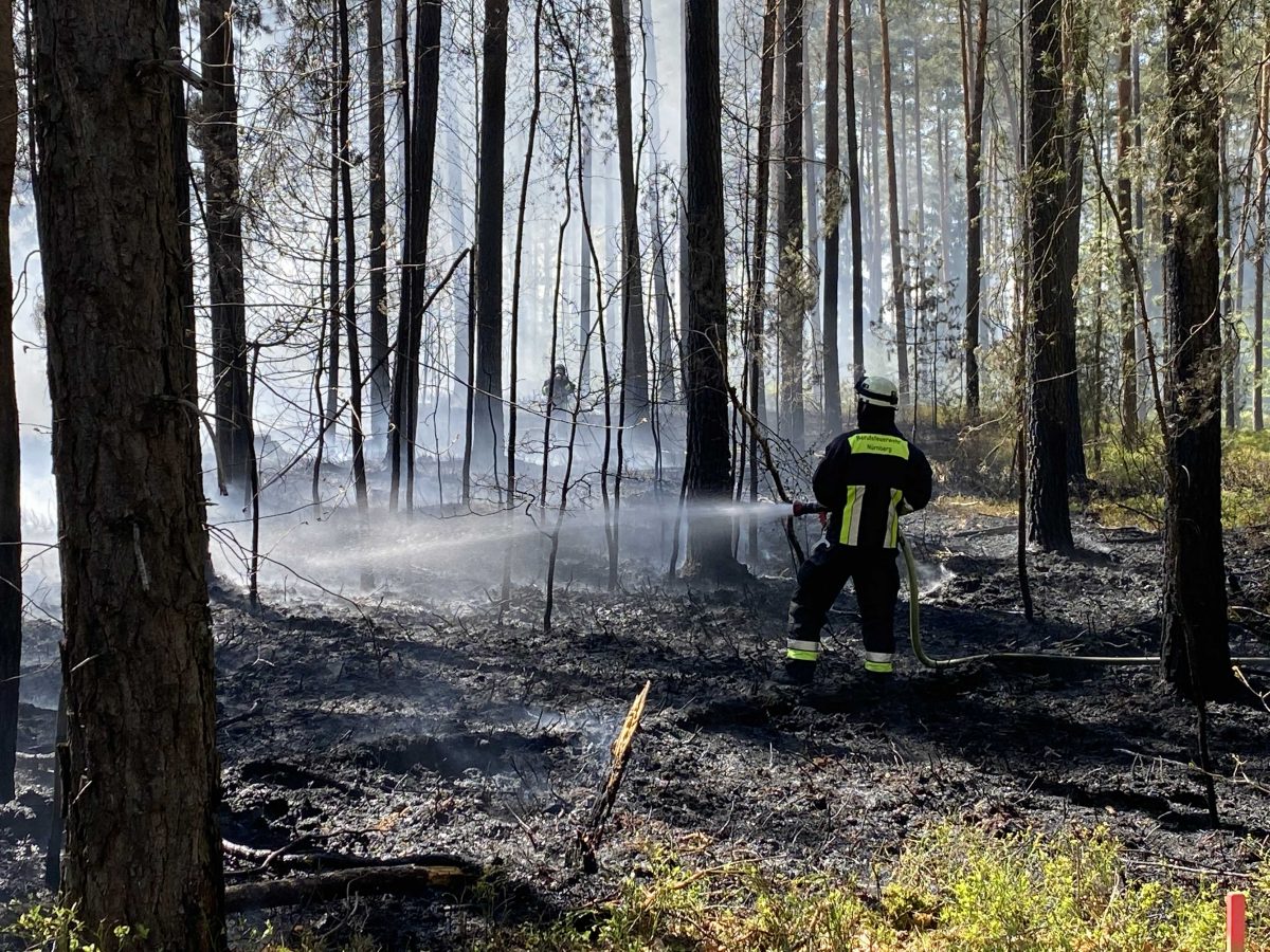 „Wir haben das Feuer in den Griff bekommen, kurz bevor uns das Wasser ausgegangen ist. Das stand Spitz auf Knopf“, sagt Einsatzleiter Bastian Richter kurz vor 16 Uhr. Gefahr durch das Feuer selbst besteht während der Löscharbeiten weder für Personen noch für die nahen Industriebetriebe. Sorge bereitet Richter jedoch der Waldboden.