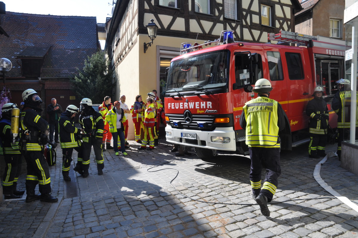 LAUF — Großeinsatz der Feuerwehr am Freitag mitten in der Laufer Altstadt: 35 Einsatzkräfte und Löschfahrzeuge aus Lauf, Heuchling und Rückersdorf waren vor Ort, als gegen 14 Uhr Alarm gegeben wurde. Grund war eine sogenannte Verpuffung, also eine Fehlzündung mit anschließender kleinen Explosion in einer Heizung im Keller eines Gebäudes in der Burggasse. Zwei Feuerwehtrupps gingen mit Sauerstoffflaschen ins Gebäude, brachen mit einer Axt die Wohnung im ersten Stock auf und konnten bald Entwarnung geben. Zum Zeitpunkt der Verpuffung befand sich niemand im Haus. „Wir haben sowohl im Keller als auch in der darüber liegenden Wohnung einen hohen Kohlenstoffmonoxid-Gehalt festgestellt, deshalb wurden die Räume belüftet“, sagte der stellvertretende Kommandant der Laufer Feuerwehr, Volker Schmidt, der PZ. Zum Einsatz kam ein spezielles Be- und Entlüftungsgerät. Anschließend wurden die Böden mit Wärmebildkameras kontrolliert, um weitere Gefahren auszuschließen. Foto: Kirchmayer