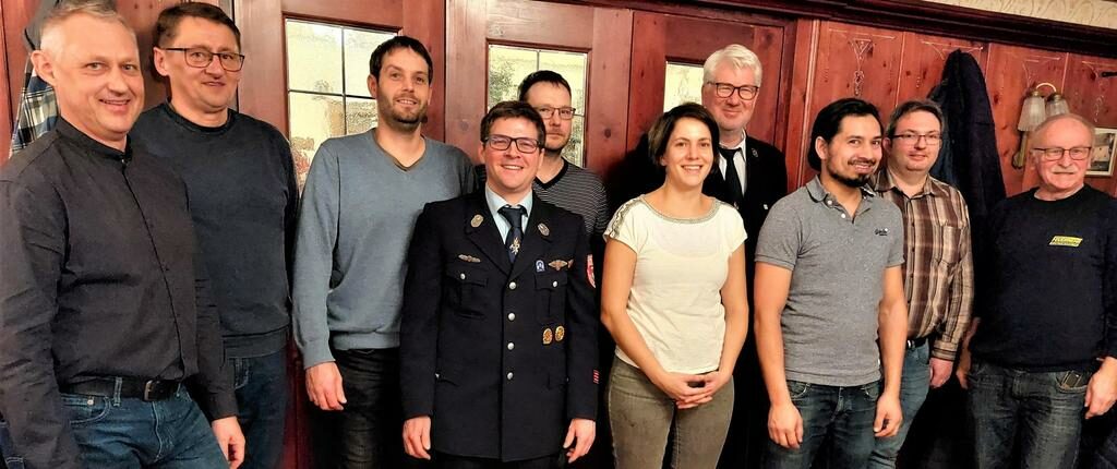Die neue Mannschaft, von links nach rechts, hintere Reihe: 2. Vorsitzender Andreas Ertel, Kassier Herbert Schötz, Beisitzer Alexander Götz und Andreas Haas, 1. Kommandant Markus Ertel, Kreisbrandinspektor und 2. Bürgermeister Thorsten Brunner, Beisitzer Erwin Bleisteiner, vordere Reihe: 2. Kommandant und 1. Vorsitzender Christian Schmidt, Beisitzer Kathrin Patermann und Schriftführer Sebastian Ambos.