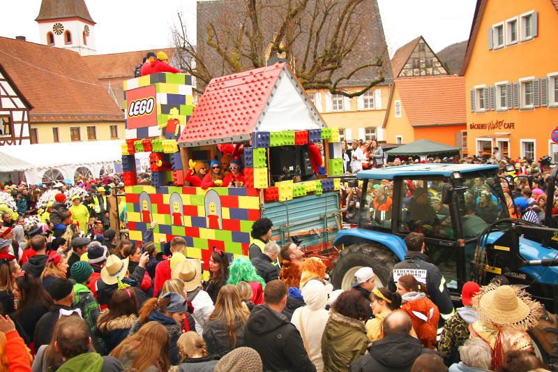 Der Schnitzelverein veranstaltete während des Zuges ein Becherwerfen. Die Schneemänner dahinter sind sonst in Hohenstadt zu Hause. In 80 Tagen wollten die Fierabächer um die Welt und zwar in einem Traktorgespann. Die Damen vom Gemeinschaftshaus hatten sich in Dominosteine verwandelt. Knallig war der Ort See mit einem Legoland auf Rädern unterwegs. Der Obst-und Gartenbauverein Hartenstein sorgte mit großen Pusteblumen für einen Hingucker. Die Engenthaler Kirwaleut machten einen Zwergenaufstand.