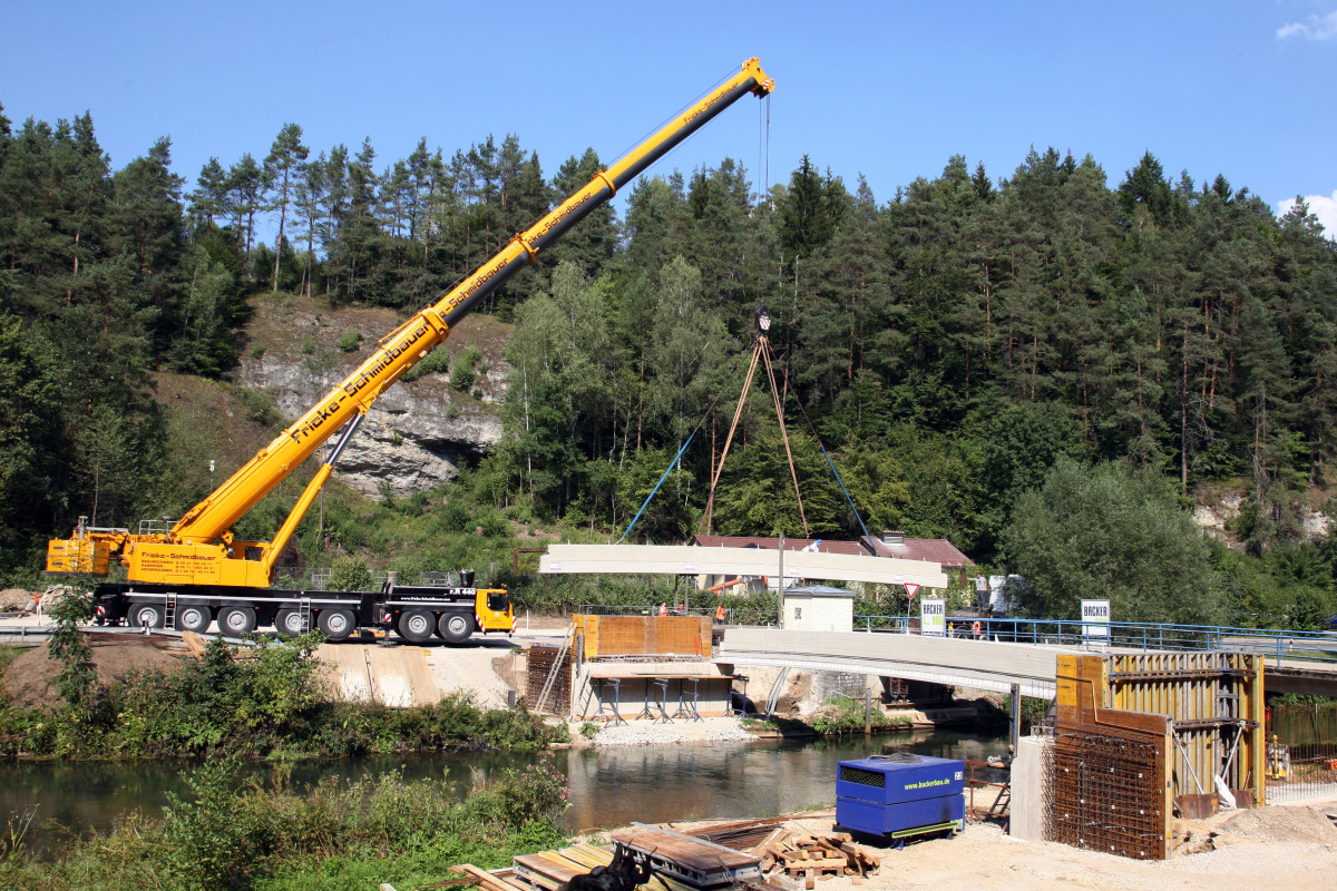 Mit einem Autokran wurden die bis zu 28 Tonnen schweren Stahlbetonfertigteile der neuen Pegnitzbrücke bei Lungsdorf auf ihren vorgesehenen Platz gehievt. Foto: A. Tauber2015/09/neubau_bruecke_lungsdorf_01.jpg