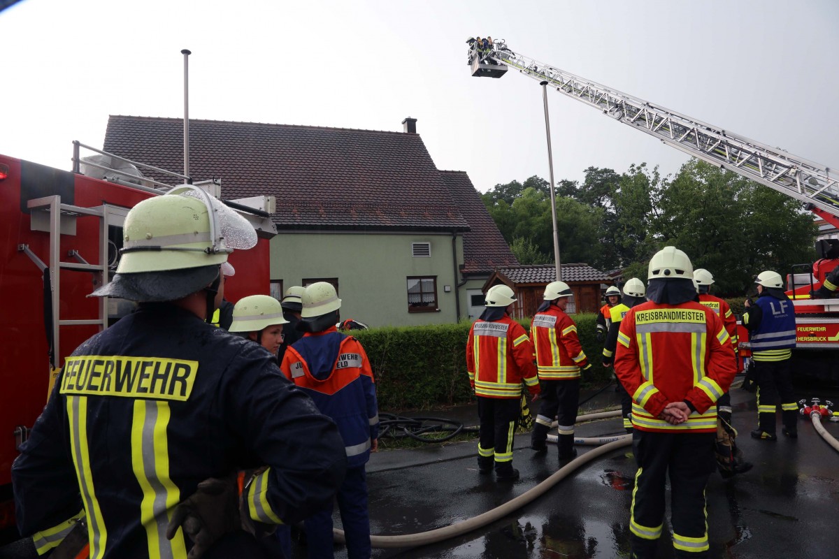 HENFENFELD – Bei dem kurzzeitigen Gewitter gegen 16.30 Uhr am Dienstag schlug ins Dach der Henfenfelder Awo-Begegnungsstätte der Blitz ein. „Dachstuhlbrand“ hieß es bei der Feuerwehralarmierung. Als die Einsatzkräfte eintrafen, rauchte es zwar aus dem Giebel, Flammen schlugen ihnen aber nicht entgegen. Die Henfenfelder Wehr löschte im Nu. Hinzugezogen wurden auch die Feuerwehren Altensittenbach und Hersbruck. Atemschutzträger untersuchten das Dach nach Brandnestern von der Drehleiter aus (Bilder). Der Blitzschlag und Brandeinsatz in Bahnhofsnähe fiel genau in die Zeit, in der die Berufspendler zurückkehren. In der gesperrten Ottensooser Straße und Bahnhofstraße gab es für sie für eine Weile kein Durchkommen.