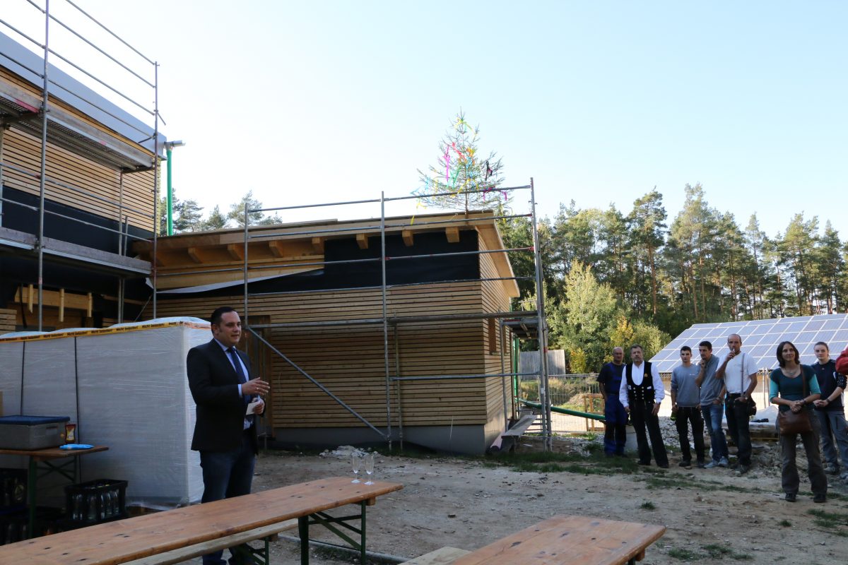 Und noch einen ökologischen Pluspunkt – neben der flächenschonenden Bauweise – habe die neue Halle, erläutern Thiel und Holzinger: Die Fassade ist aus Naturholz, nicht chemisch behandelt und aus der Region. Auch die Dämmung ist mineralisch. „Geklebt wurde an der Fassade nichts“, sagen sie, während hinter ihnen die Zimmerer noch rasch das mit bunten Bändern geschmückte Bäumchen fürs Richtfest anschrauben.