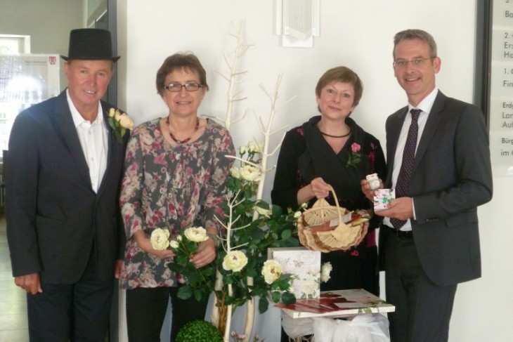 HERSBRUCK – Jetzt kann der Hersbrucker Rosenzauber losgehen, denn auch das Rathaus versprüht rosiges Flair, und zwar nicht nur, weil Bürgermeister Robert Ilg (rechts) von den Organisatorinnen Brigitte Birner (Zweite v. links), Doris Kiener (Zweite v. rechts) sowie Margarete Panke zum Auftakt der Rosenwochen ein rosiges Geschenk für einen romantischen Abend daheim bekommen hat. Das Foyer strahlt dank Panke, die es ehrenamtlich geschmückt hat, nämlich auch im passenden Outfit. Die Damen, unterstützt von Rudi Wolfermann (links), der beim rosigen Stadtspaziergang mit dabei ist, stellten Ilg das Programm der nächsten zwei Wochen vor und erzählten, dass die ersten Anfragen, ob der Rosenzauber des Wirtschaftsforums wieder stattfände, bereits im Mai kämen. Ilg dankte den fleißigen Frauen für ihren ehrenamtlichen Einsatz, der Hersbruck weit über die Region hinaus bekannt mache. Foto: privat